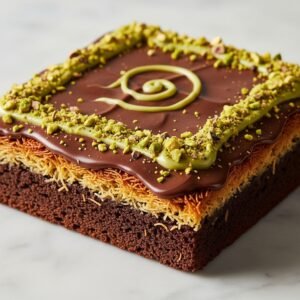 Store these brownies chilled so the ganache and pistachio layer hold their shape. Serve at cool room temperature for the best texture contrast, since the brownie base softens slightly while the kataifi layer still keeps its crunch. For cleaner portions, use a sharp knife and wipe it between cuts.