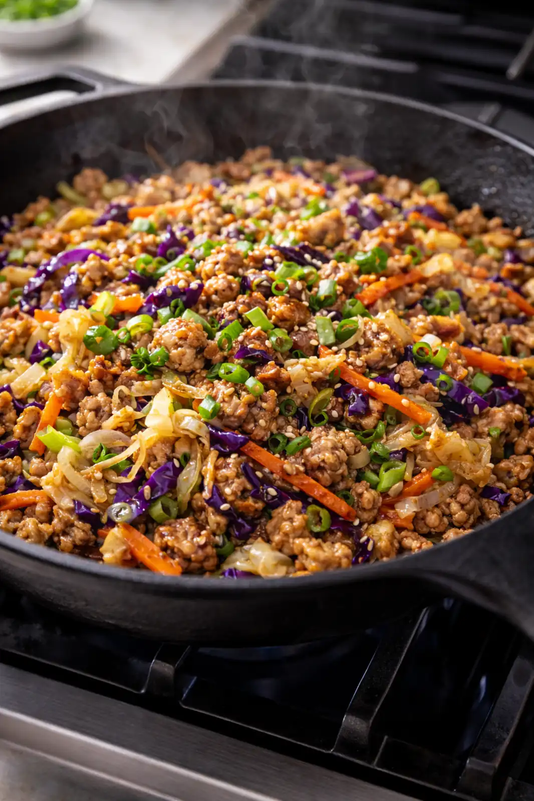 Egg Roll in a Bowl can taste too salty when the soy sauce runs strong or when additional salt goes in too early. It can also turn watery if the pan stays crowded or if the cabbage releases liquid faster than it cooks off. Overcooking the cabbage leads to a mushy texture that makes the dish feel heavy. Adding toasted sesame oil too soon can dull its flavor and make it disappear into the background. Expect a skillet stir-fry texture rather than a crisp egg roll bite, since the wrapper is not part of the dish.
