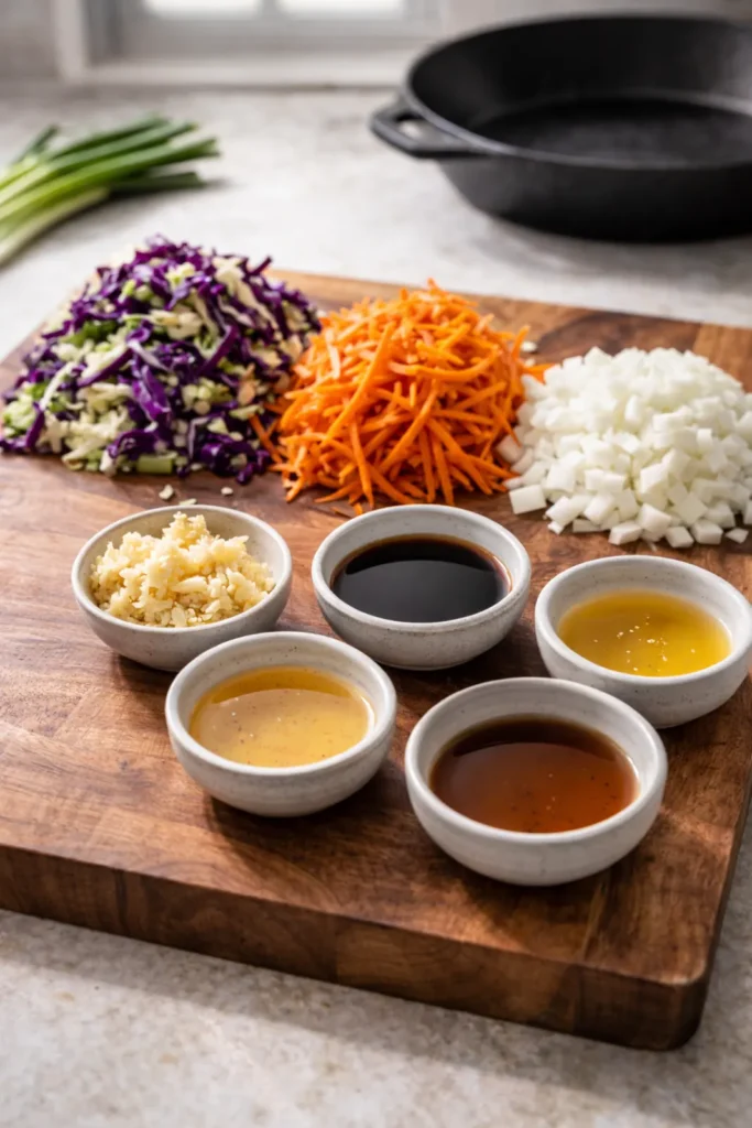 Ground turkey keeps the dish lighter, while ground pork adds more richness and a fuller “takeout-style” flavor. Sweet onion supports the natural sweetness in cabbage and carrots, but yellow onion also works. Fresh garlic and ginger give the strongest flavor, yet jarred versions can work in a pinch if used with restraint. Chicken broth helps loosen the pan drippings and keeps the mixture saucy without turning it watery. For cabbage, freshly shredded gives the best texture, but coleslaw mix offers speed and consistent shred size. Soy sauce brings salt and umami, tamari can reduce harsh saltiness and often fits gluten-free needs, and coconut aminos provide a milder, slightly sweeter option.