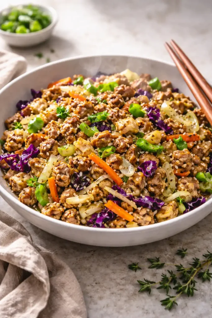 This dish tastes satisfying because it layers aromatics early and adds toasted sesame oil at the end for a clean, nutty finish. Rice vinegar sharpens the sauce so the cabbage tastes bright instead of flat. The cabbage cooks down from bulky shreds into a tender bite with a little resistance, which is the texture most people want in Egg Roll in a Bowl. Using one skillet keeps the flavors concentrated, and the sauce clings to the meat and vegetables instead of pooling. Serving it over white rice turns it into a heartier bowl, while serving it alone keeps the focus on the savory cabbage-forward stir-fry style.