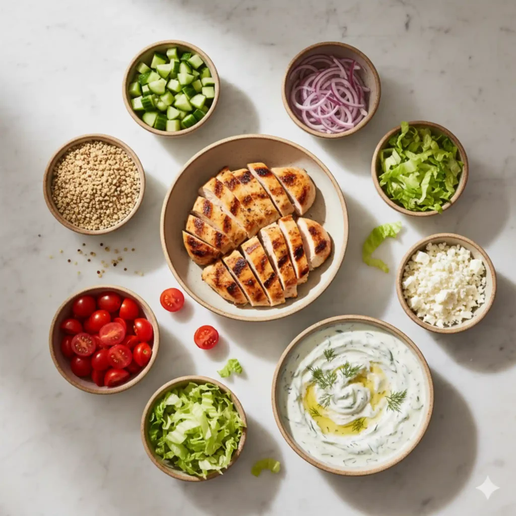 Store chicken, rice or quinoa, chopped vegetables, and tzatziki in separate containers to protect texture. Keep lettuce apart from wetter items like cucumber and tomatoes whenever possible. Refrigerate components promptly and use them within a few days for best freshness. Warm the chicken and grain base, then add cold vegetables and sauce right before eating to keep the bowl balanced.