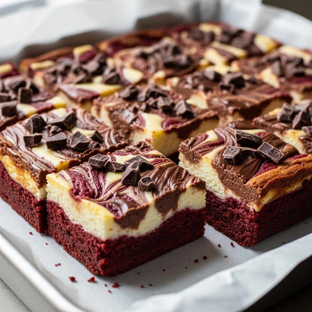 For variations, adjust the chocolate mix-ins to match the sweetness level you want. Use more dark chocolate for a deeper finish or more white chocolate for a sweeter contrast against the tangy red velvet base. You can also emphasize one cheesecake flavor by making larger swirls of vanilla or chocolate for a more defined look in each slice.