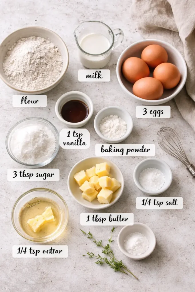 Even though they look like something from a specialty brunch spot, the ingredient list is wonderfully simple. Eggs, milk, flour, sugar, and a few pantry basics come together to create a stunning result. That makes this recipe approachable for home cooks who want something impressive without a long shopping list.